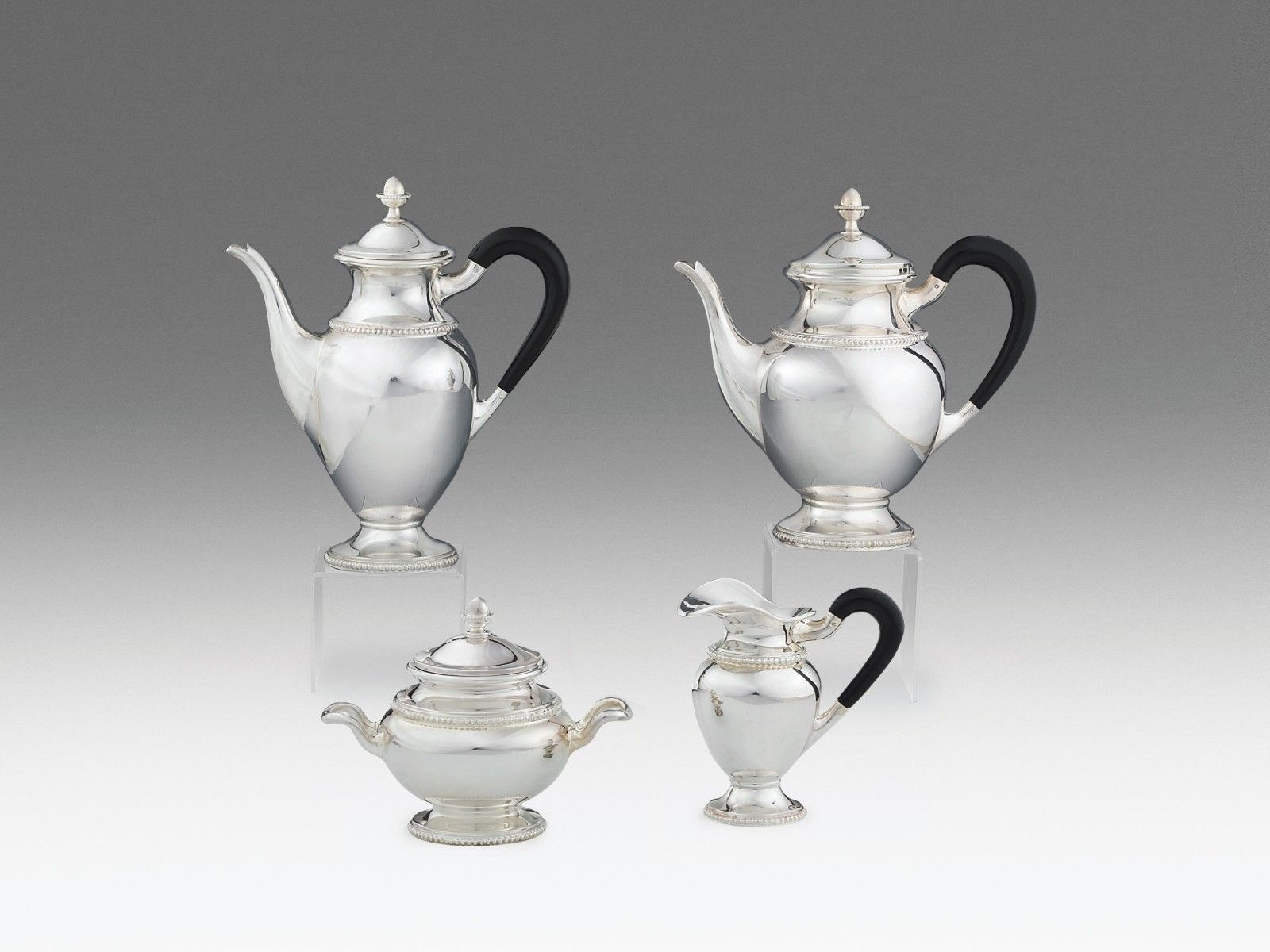 Ezüst, 2168 g. Teáskanna, ún. sűrítményes kanna, tejkiöntő és cukortartó. Öblös edények, ívelt kiöntőcsőrrel, feketére pácolt fa fülekkel, peremeken gyöngysordísz. Zsanéros fedeleken toboz alakú fogók.