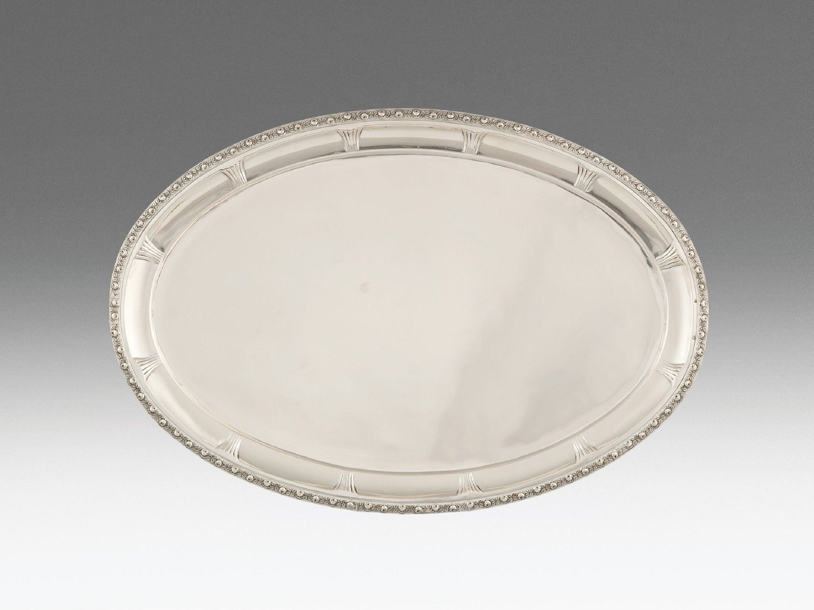 Ezüst, 1036 g. Ovális forma, peremén vésett bécsirózsás bordűrrel.