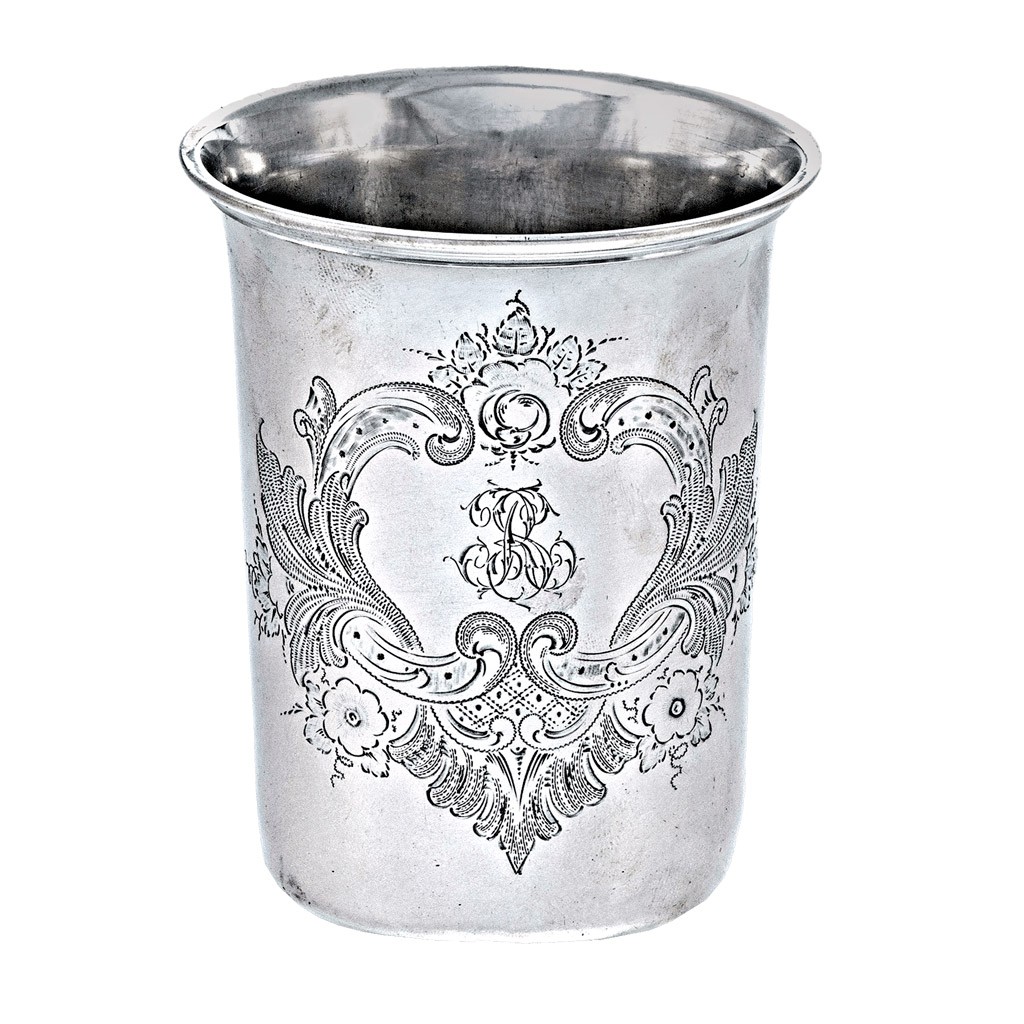 magyar, 1867-es év második fele, 13 latos antik ezüst, "DK" mesterjegy, palástján vésett díszítéssel, SR tulajdonosi monogrammal, restaurált