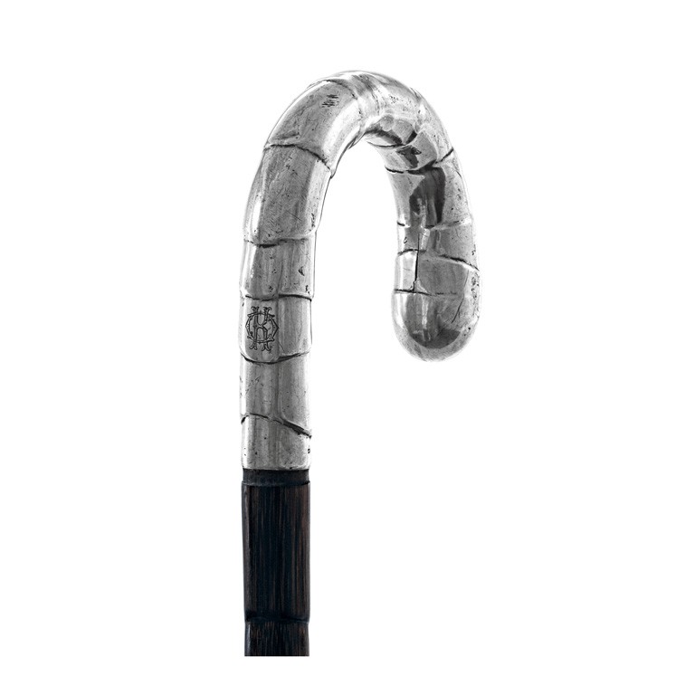 Bécs, 19. sz. vége, 1872-1922 közötti fémjel, 750 ezrelékes ezüst fogó kivehetetlen mesterjeggyel, "KO" vésett monogrammal, festett nád bottal, h: 89 cm
