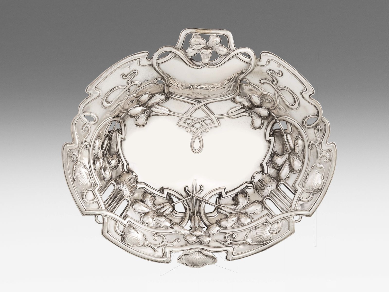 Kikiáltási ár: 260 000 FtEzüst, 153 g. Lábakon álló öblös tál, kétoldal, rokályos fülekkel. Peremén domborított és poncolt, virágos-leveles díszítményekkel. Restaurált. Feltehetően német, XIX. század közepe, MK mesterjeggyel. M.: 36 × 18,5 × 9,5 cm