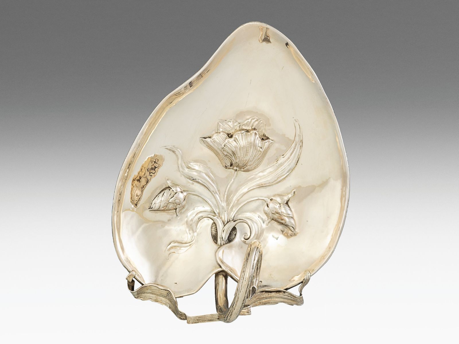 Ezüst, 381 g. Három golyó lábon álló levél formájú tál, leveles szár alakú fogóval. Öblében domborított, poncolt és vésett