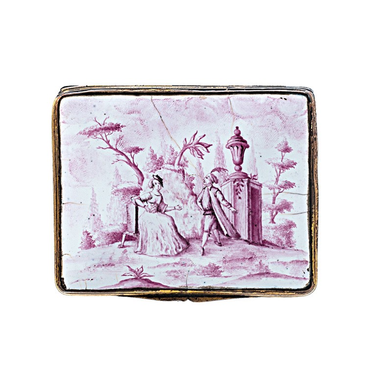francia, 18. sz. vége, zománcfestett rézlemez, kívül-belül udvarlási és keleti jelenetekkel díszített, széleken tűzaranyozással, sérült, 8,2*6,8*4,2 cm
