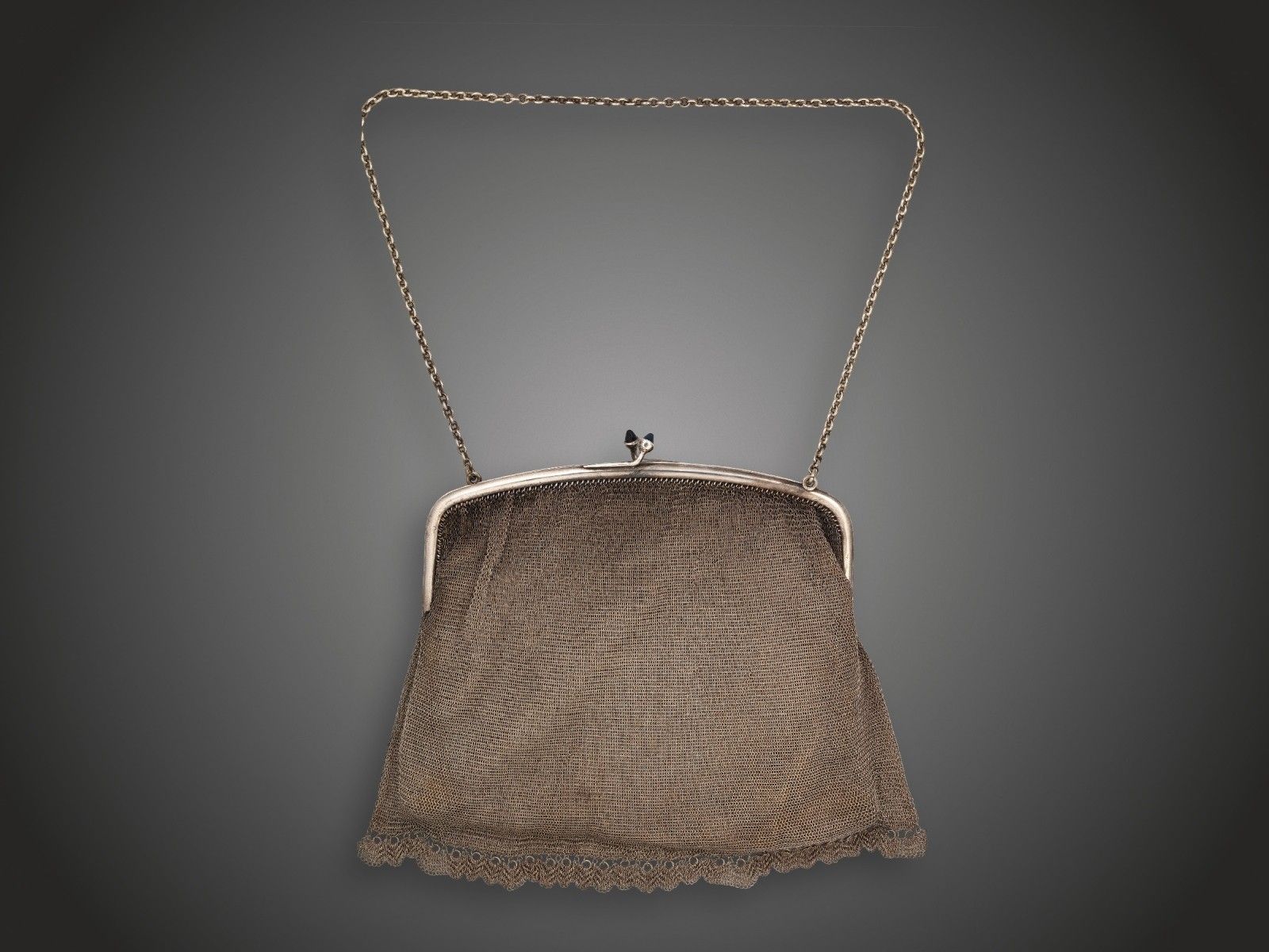 Ezüst, 149 g. Sodronyszövet alján csipke szegéllyel. Keretén kék, köves patent zárral. Szarvasbőr bélése kopott.