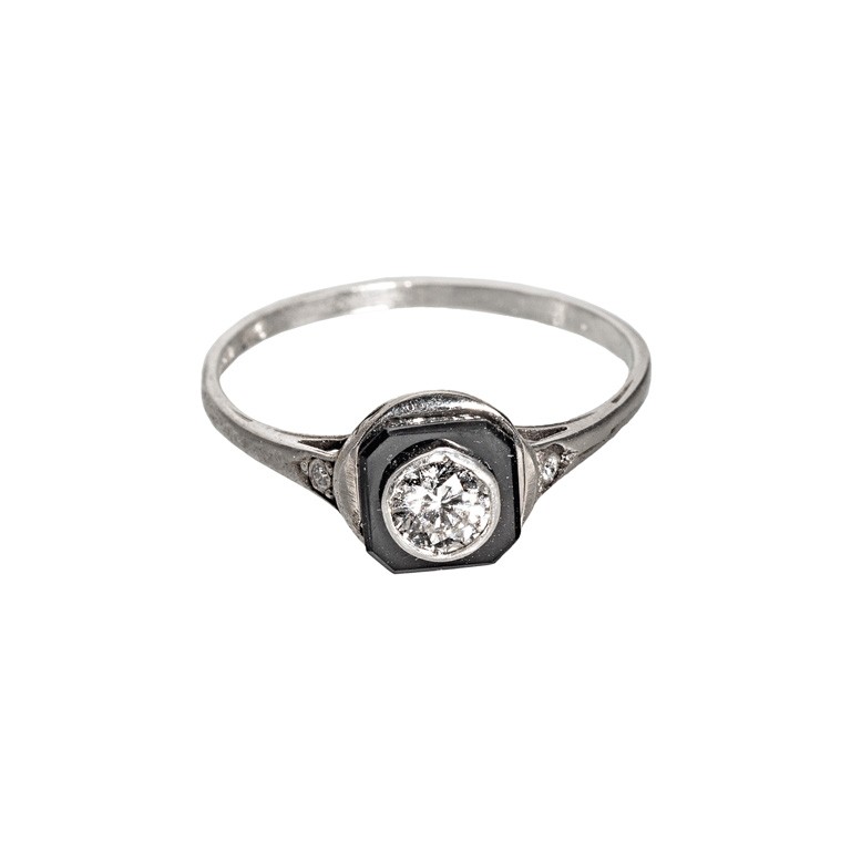 angol, 1920 körül, 2016 utáni budapesti fémjellel ellátva, 14 k fehérarany, szögletes fej fekete ónix lapba ültetett azsúr foglalatú félmodern csiszolású briliánssal cca. 0,25 ct (M2, TCr, VVS), díszítve dobozával, 1,4 g