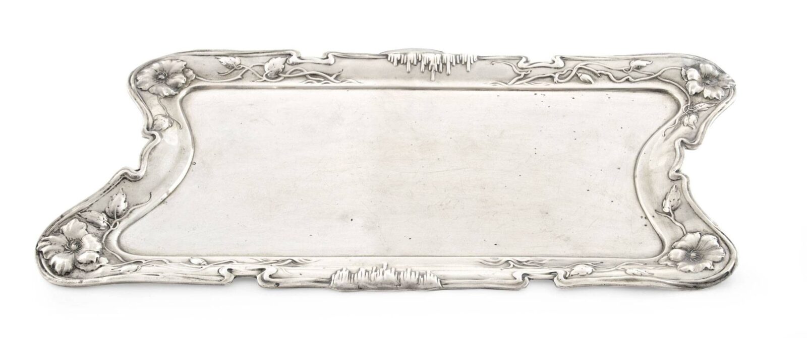 osztrák, 1867-1937 közötti fémjellel, 800 ezrelékes ezüst, FR mesterjeggyel, indás, növényi ornamentikás díszítéssel, hullámvonalas szegéllyel, h: 51 cm, 910 g