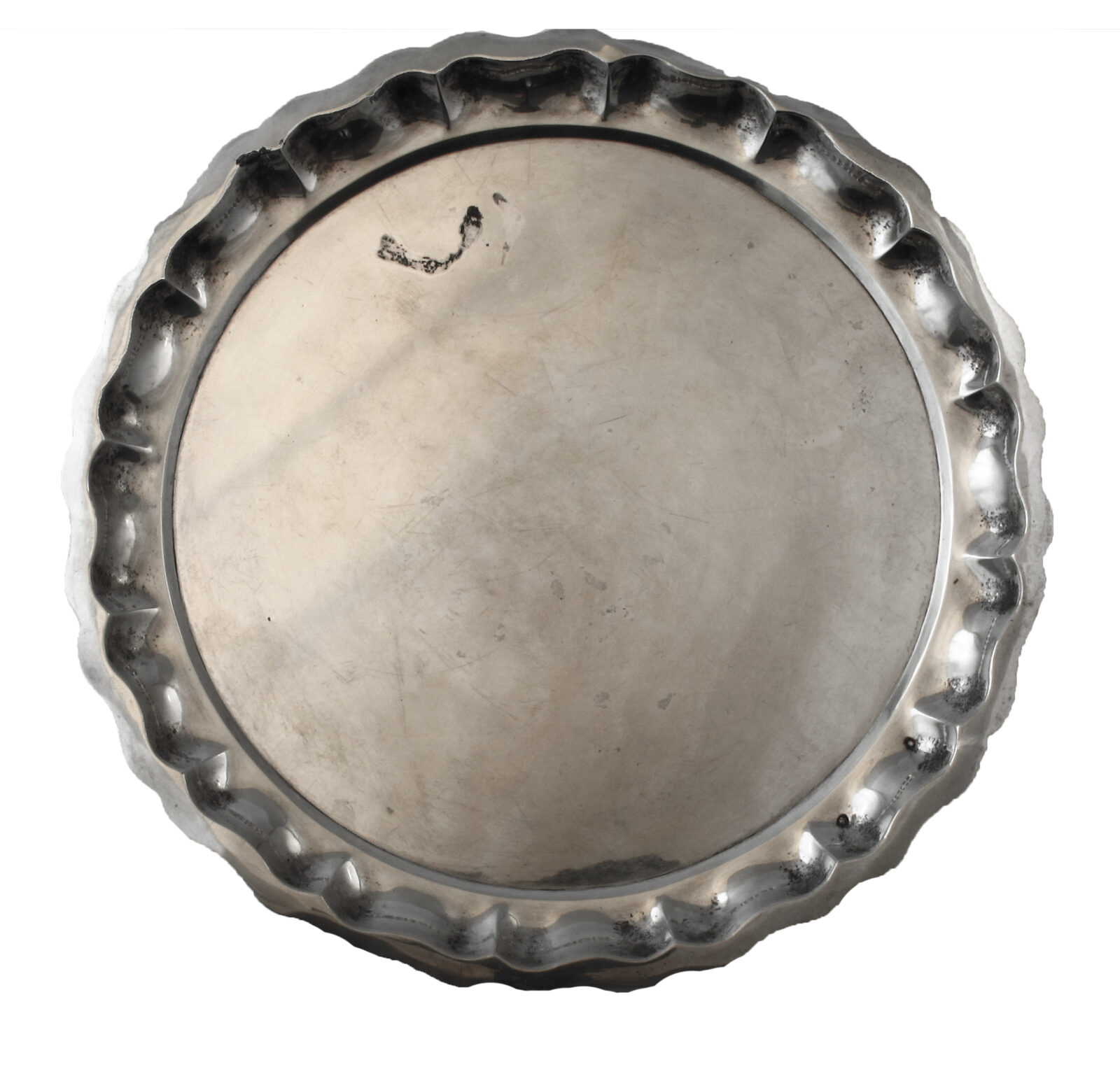 Ezüst. Kerek forma, trébelt karéjos peremmel (pereme egy része kikalapálásra szorul). 1937- 1966., Pest. Súly: 306 gr. Átmérő: 25 cm