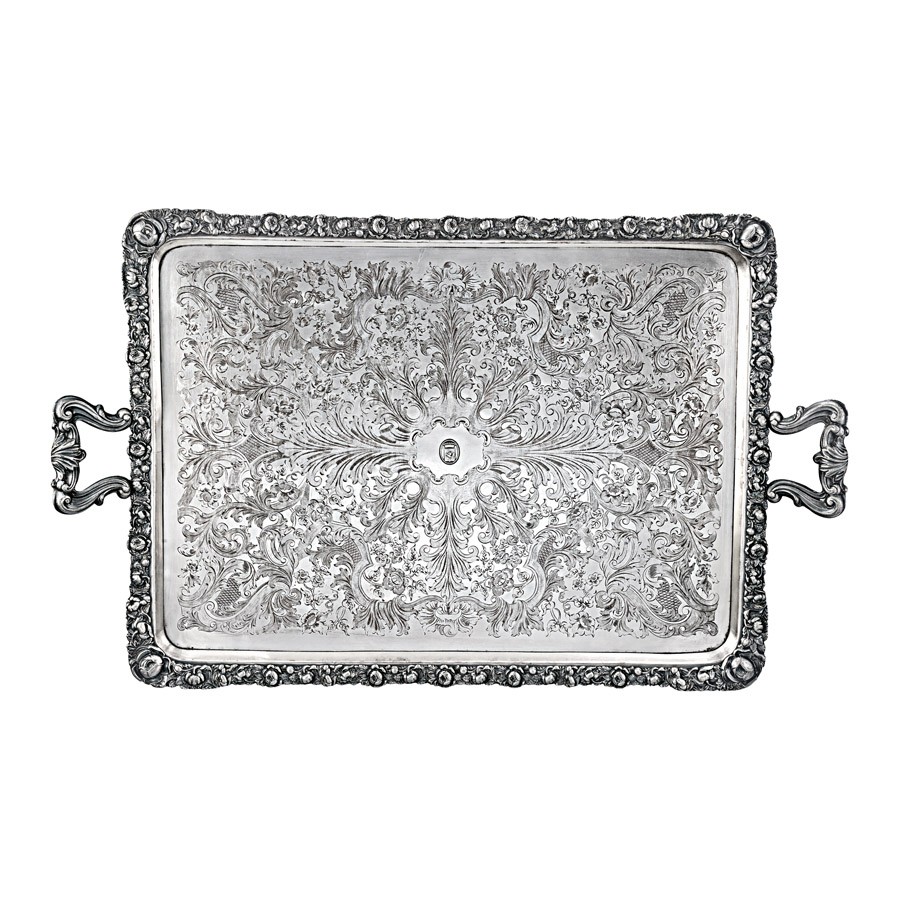 19. sz. vége, préselt, kalapált vörösréz, kissé kopott ezüstözéssel, középen koronás családi címerrel, talp fa betéttel megerősítve, 78*47 cm