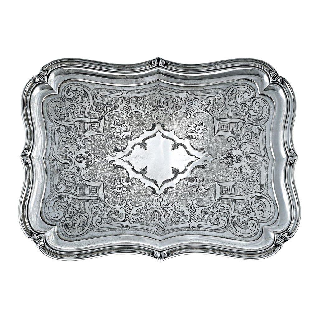 osztrák (?), 19. sz. második fele, 13 latos antik ezüst, mesterjegy nélkül, hullámzó peremű test, gazdagon vésett, poncolt díszítéssel