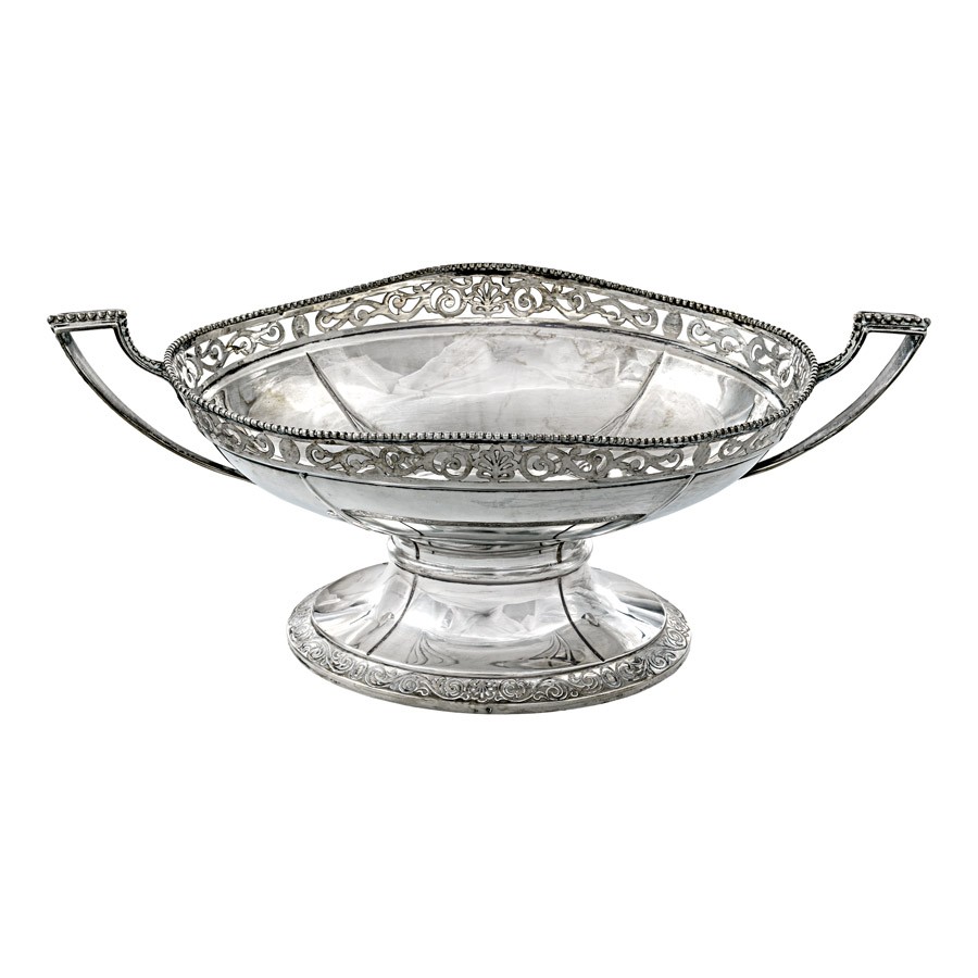Pest, 1867-1936 közötti fémjel, 800 ezrelékes ezüst, Bachruch Antal 1921-előtti mesterjegye, ovális, talpas, kétfülű forma, áttört, gyöngysordíszes peremmel, 1108 g; 19*44, 5 cm