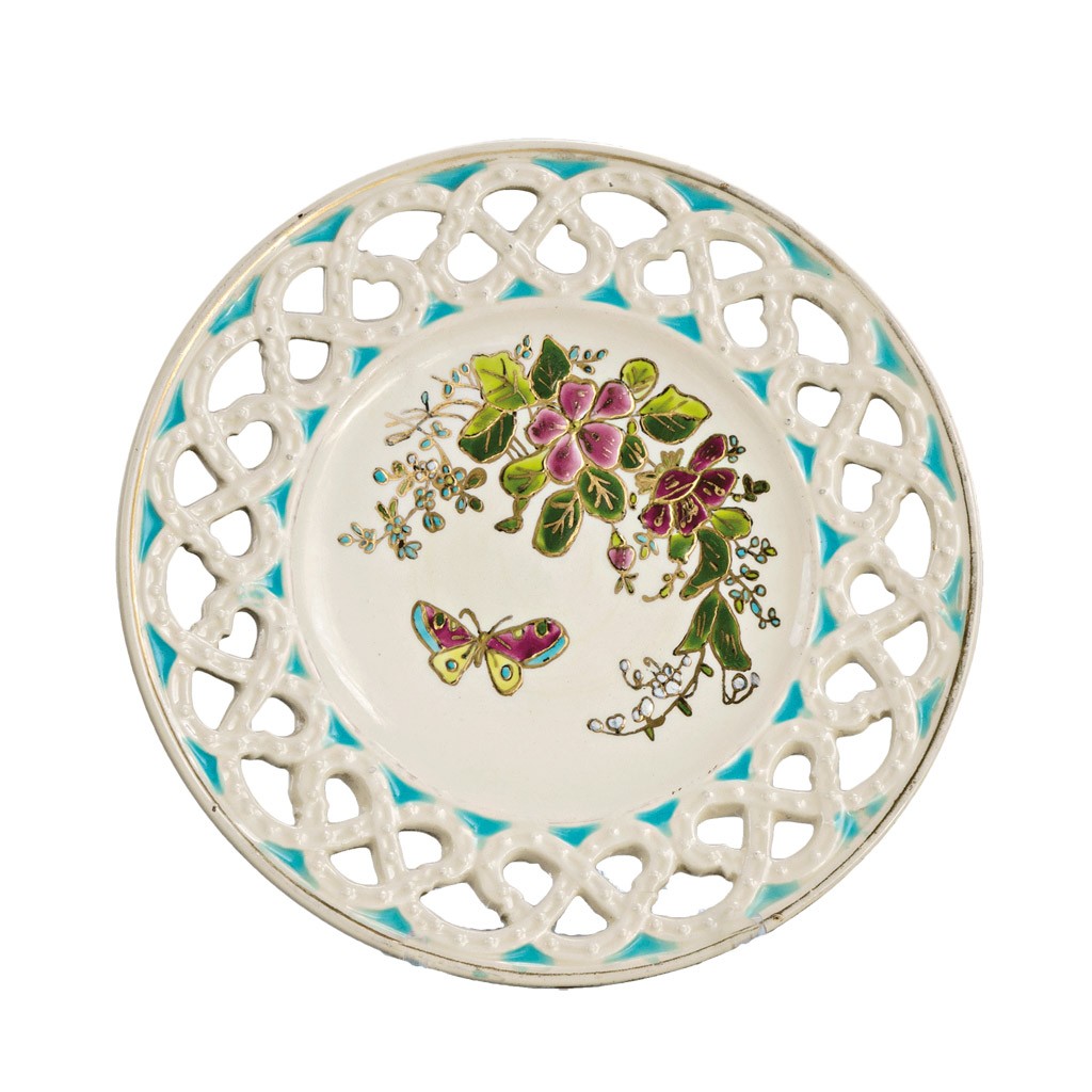 Schütz Cilli, 19. sz. vége, festett, aranyozott fehércserép áttört peremmel, jelezve az alján, egyik ajándékozási felirattal