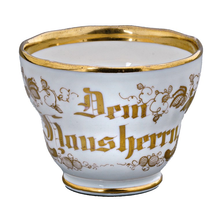 KPM, 19. sz. vége, festett, aranyozott porcelán, "Dein Hausherrn" felirattal, jelezve az alján, m: 8 cm