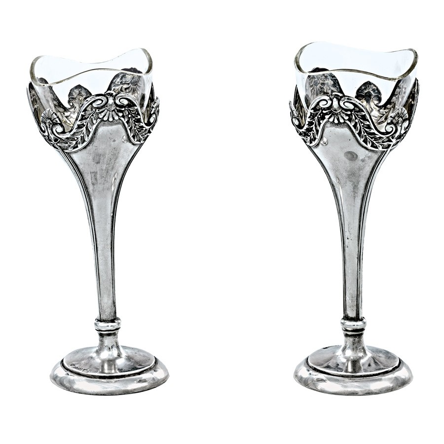 német, 1888 utáni hold korona fémjellel és 1902 előtti bécsi behozatali jellel, 800 ezrelékes ezüst, kecses tölcsér forma, babérfüzéres szegéllyel és KM vésett, koronás tulajdanosi monogrammal, színtelen üveg betétekkel, feltöltéssel megerősített talpakka