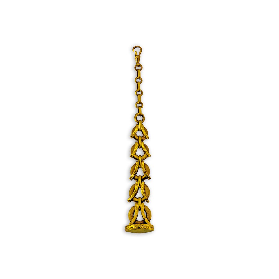 Kikiáltási ár: 85 000 Ft20. sz. vége, art deco stílusú csat, 2005 utáni budapesti fémjellel ellátva, 14 k sárga arany áttört hátlappal, ezüsttel lemezelve, ovális csiszolású rubin kabusonnal, 2 db apró gyémánttal, láncon 151, db lencse alakú rubin szemmel, Btto: 19,6 g; h: 44,5
