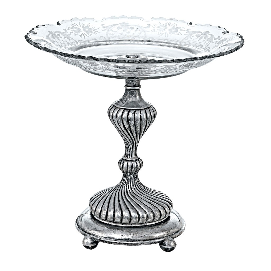 Pest (?), 1867-1936 közötti fémjel, 800 ezrelékes ezüst, "RF"(?) mesterjegy, négy golyó lábon, széles kerek talp, csavartbordás, váza alakú szárral, vésett IB monogrammal, csiszolt üveg tállal