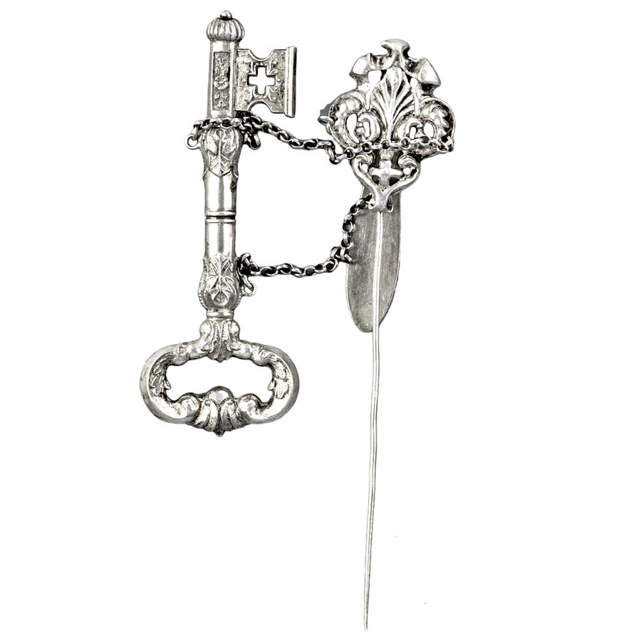 19. sz. közepe, antik ezüst, chatelaine megoldású, préselt, üreges, kulcs alakú tok láncon, 18 g; h: 9-12, 7 cm