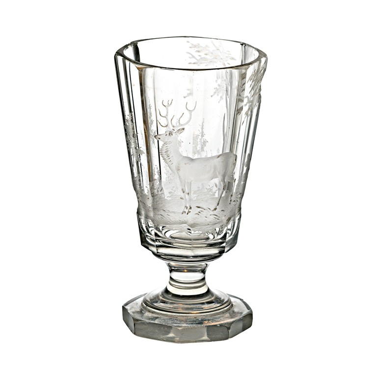 osztrák, 19. sz. vége, színtelen üveg, csiszolt, köszörült díszítéssel, m: 15,5 cm