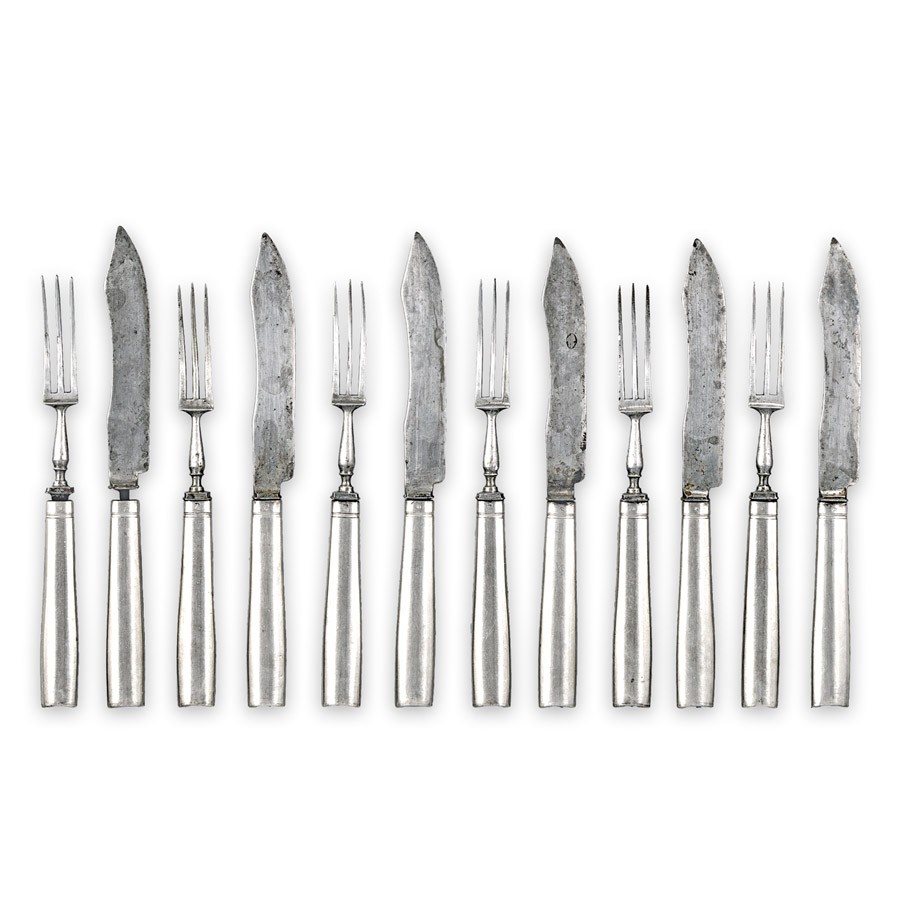 osztrák, 19. sz. közepe, 13 latos antik ezüst, IC mesterjeggyel, vésett VB monogrammal, pengén RAUCH jelzéssel, egyik sérült, Ntto:180 g; h: 22, 5-24, 5 cm
