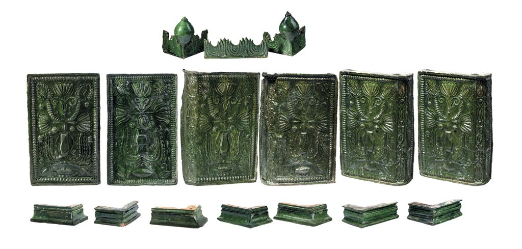 2 kályhacsempe, 4 sarokcsempe, 4 alsó perem, 3 felső perem, 2 csúcsdísz (gomb), 1 "csipke"