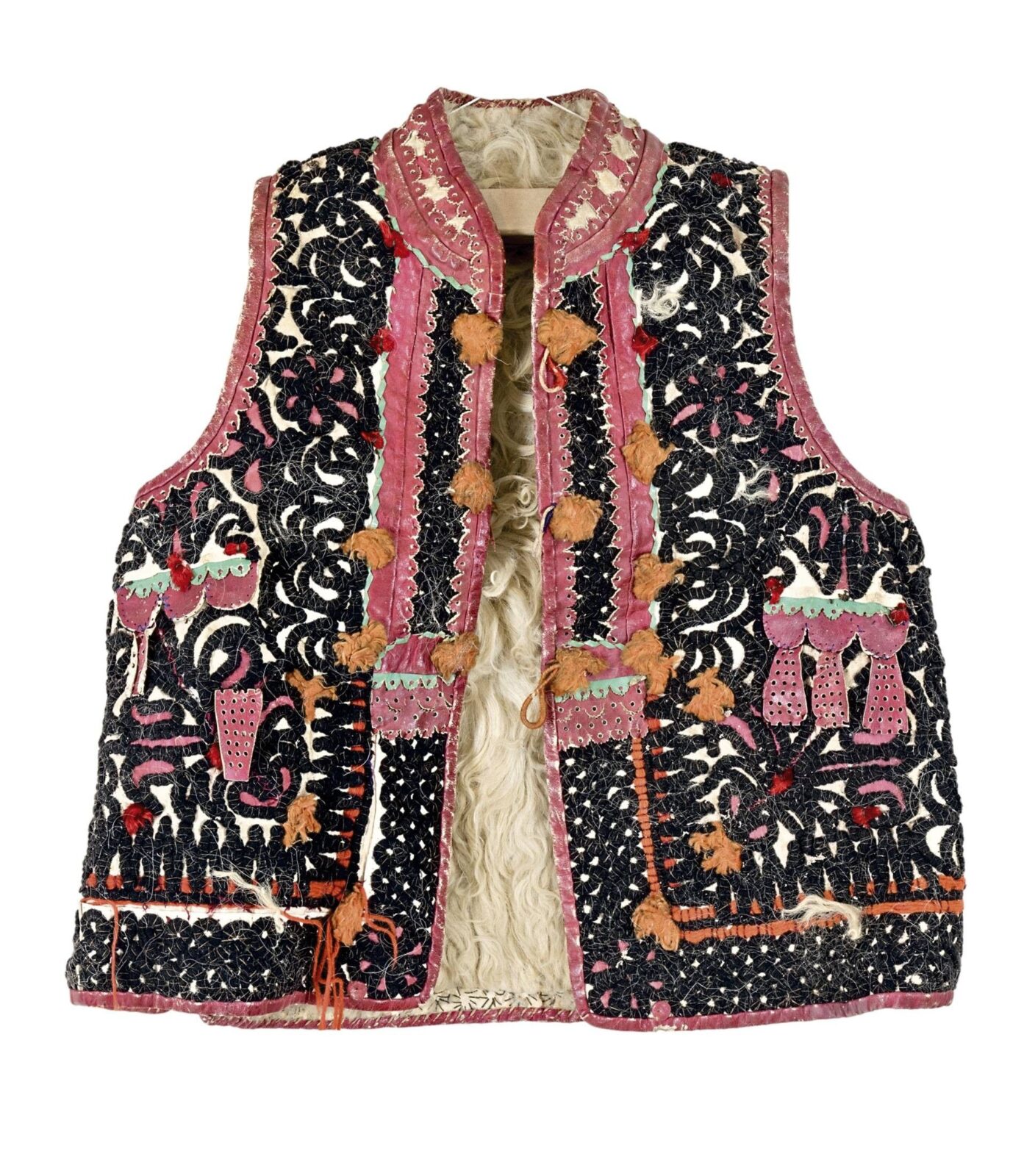 Erdély, 20. század eleje, gyapjúval hímzett báránybőr, sérült, 58*57 cm