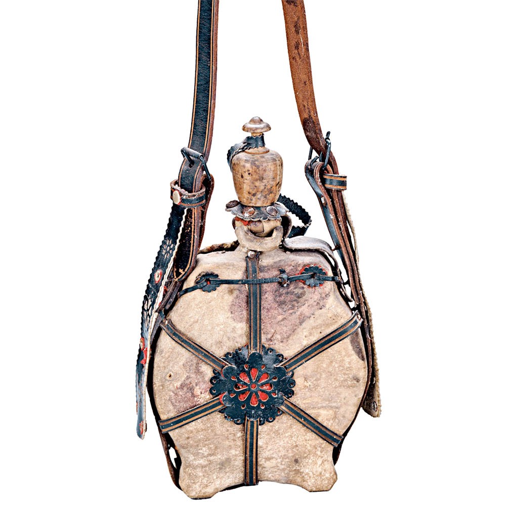 Alföld, 20. sz. eleje, esztergált fa, bőrbevonattal és szíjjal, m: 30 cm