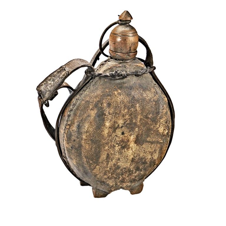 magyar, 19. sz. vége, esztergált fa testen bőr borítással, bőr szíjjal, m: 24 cm