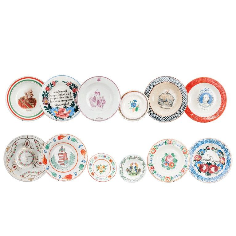 Apátfalva, Hollóháza, Karlsbad, Altrohlau, 20. sz. eleje, festett és matricás keménycserép, egy restaurált, kopott, sérült, d: 14-24 cm
