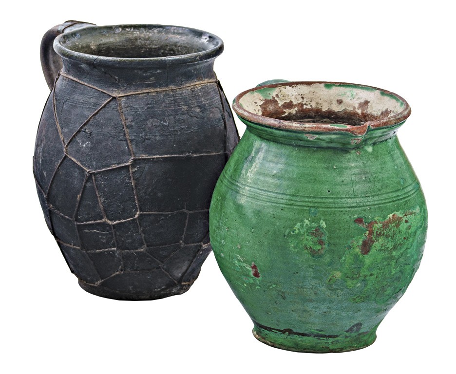 Baja, 19. sz. vége, mázatlan és mázas cserép, egyik eredeti drótos javítással, mázhibás, m: 22,5-24,5 cm