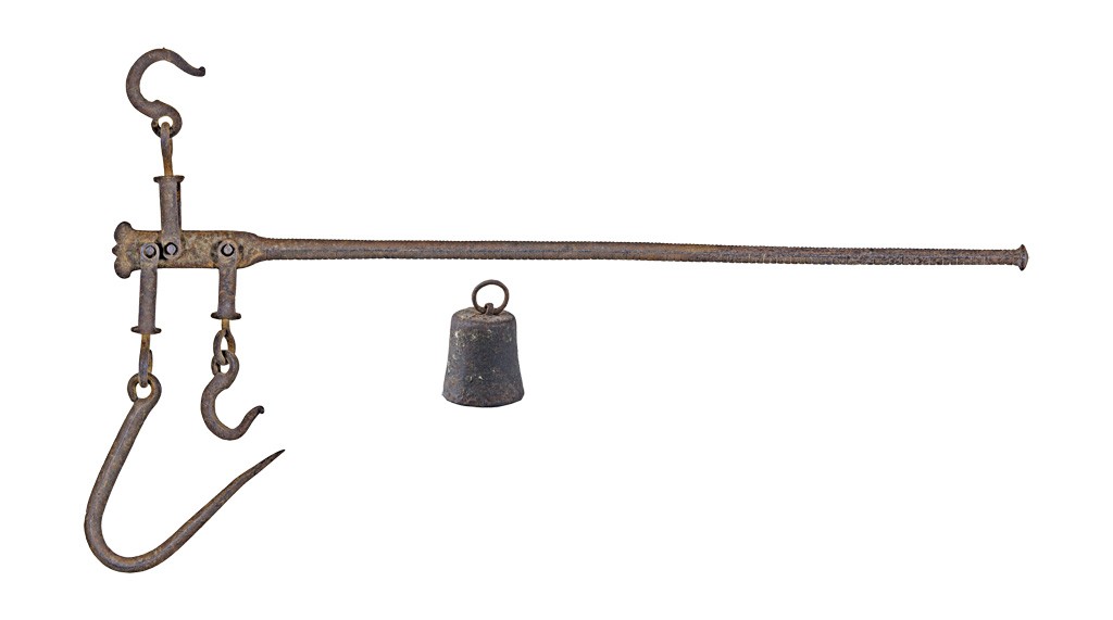 magyar, 19. sz. második fele, kovácsoltvas, egy kiegyenlítő súllyal, rozsdás, hiányos, h: 83 cm