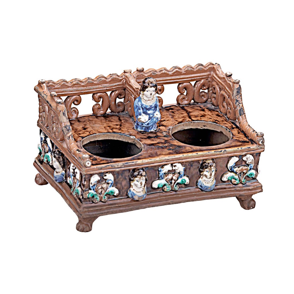 Küsmöd, 1887, mázas cserép, plasztikus díszítéssel, "Bereczki Imre készítette, Küsmödön 1887" felirattal, hiányos, egyik lába restaurált, 14*21*12,5 cm
