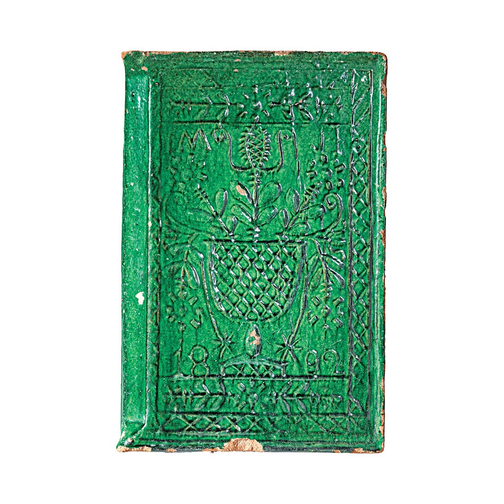 Kalotaszeg Váralmás, 1892, Müller József munkája, mázas cserép, sérült, 31,5*21 cm