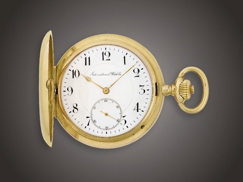 Duplafedeles férfi zsebóra IWC Arany 585, gilosált díszítésű tok, arab számos, másodperckörös, zománcozott számlap, működő ankerjáratú szerkezet, számlap, szerkezet jelzett International Watch Co. Schaffhausen, 1900 körül, szerkezetszám: 366046, bruttó 10