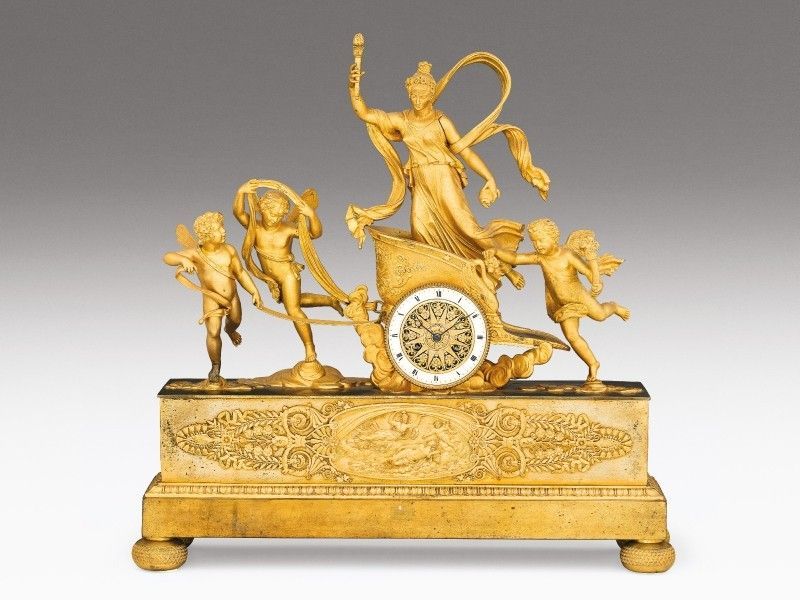 Tűzaranyozott bronz óraház: zefírek által vont harci szekéren fáklyát tartó Auróra a Hajnal Istennője, mögötte bőségszarut tartó