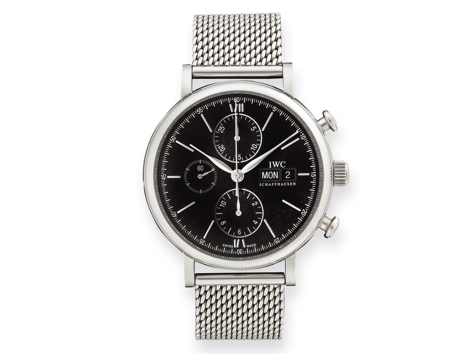 Acéltok és -csat, fekete számlap stopper segédkörökkel nap- és dátumkijelzéssel, vízálló tok tükröződésmentes zafírüveggel, stopperes automata szerkezet (cal.75820). Jelzett: IWC Schaff hausen Portofi no, referenciaszám: 3910, sorozatszám: 5594456 Átmérő: