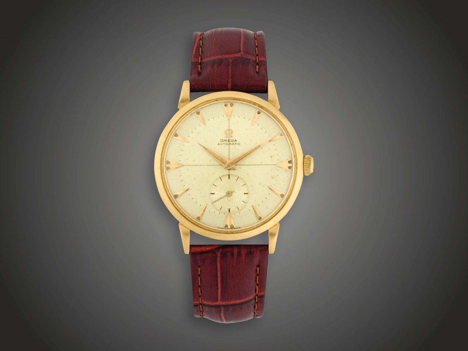 Arany 750 tok, indexjelzéses, másodperckörös, fém számlap, automata, 17 köves Omega 342 működő szerkezet, jelzett Omega Watch Co., 1990 körül, bőr szíjon, tokszám: 11100781-2659, bruttó 39,6 g, számlap átmérő: 35,0 mm, számlap ko