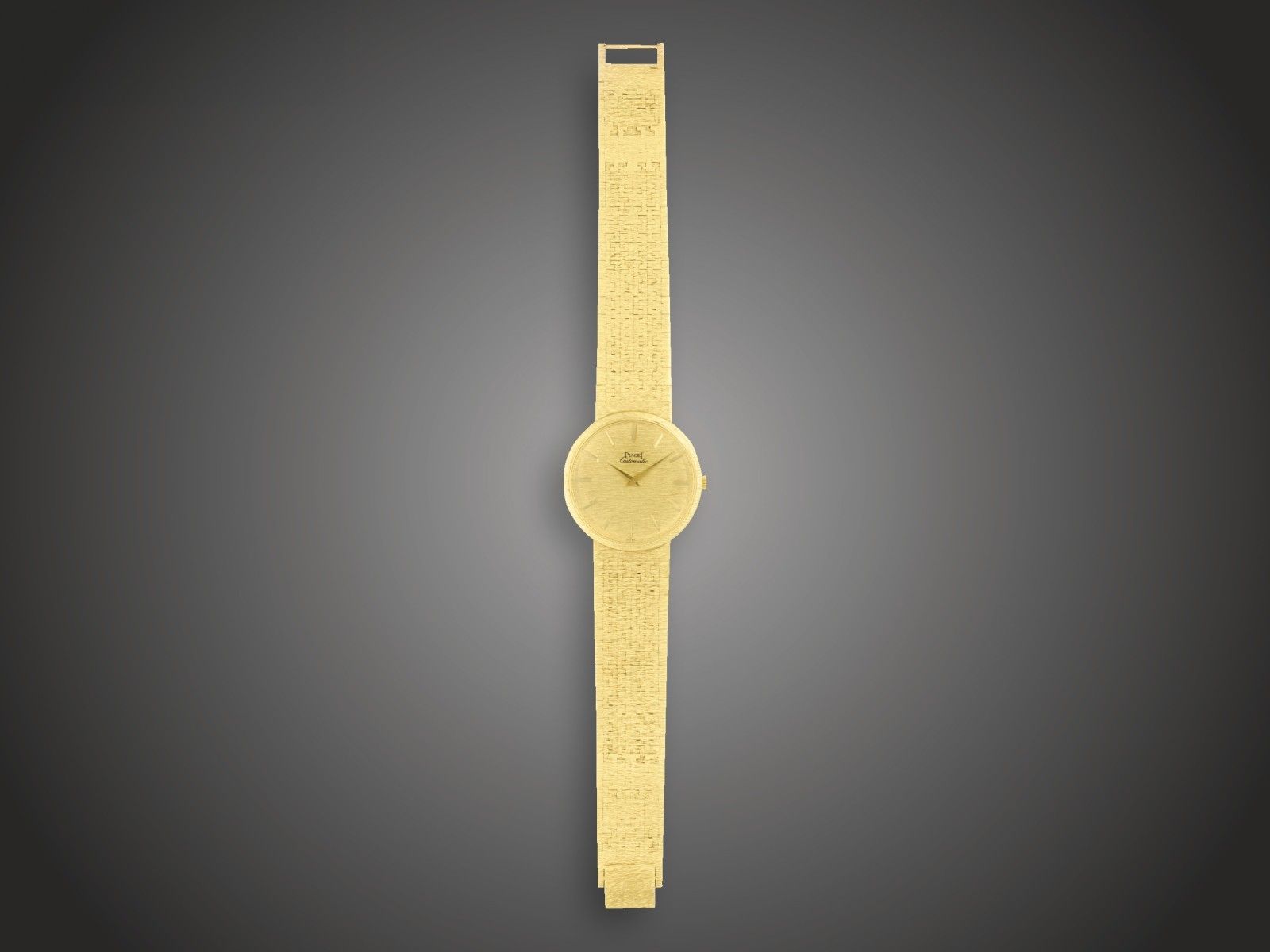 Arany 750, széles, texturált felületű karpánton kerek óratok, indexjelzéses számlap, jelzett Piaget, automata C12P1, 30 köves, mikro rotoros szerkezet, referenciaszám: 12601AG, tokszám: 228233, bruttó 78,8 g, hossz: 20 cm, számlap átm