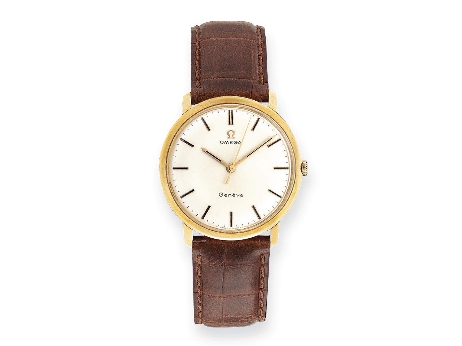 Arany 750 tok, bőrszíj, világos számlap arany indexekkel, kézi felhúzású szerkezet (Omega 601). Jelzett: Omega, tokszám: 131021SP, szerkezetszám: 28353231, bruttó: 35,1 g Átmérő: 33 mm