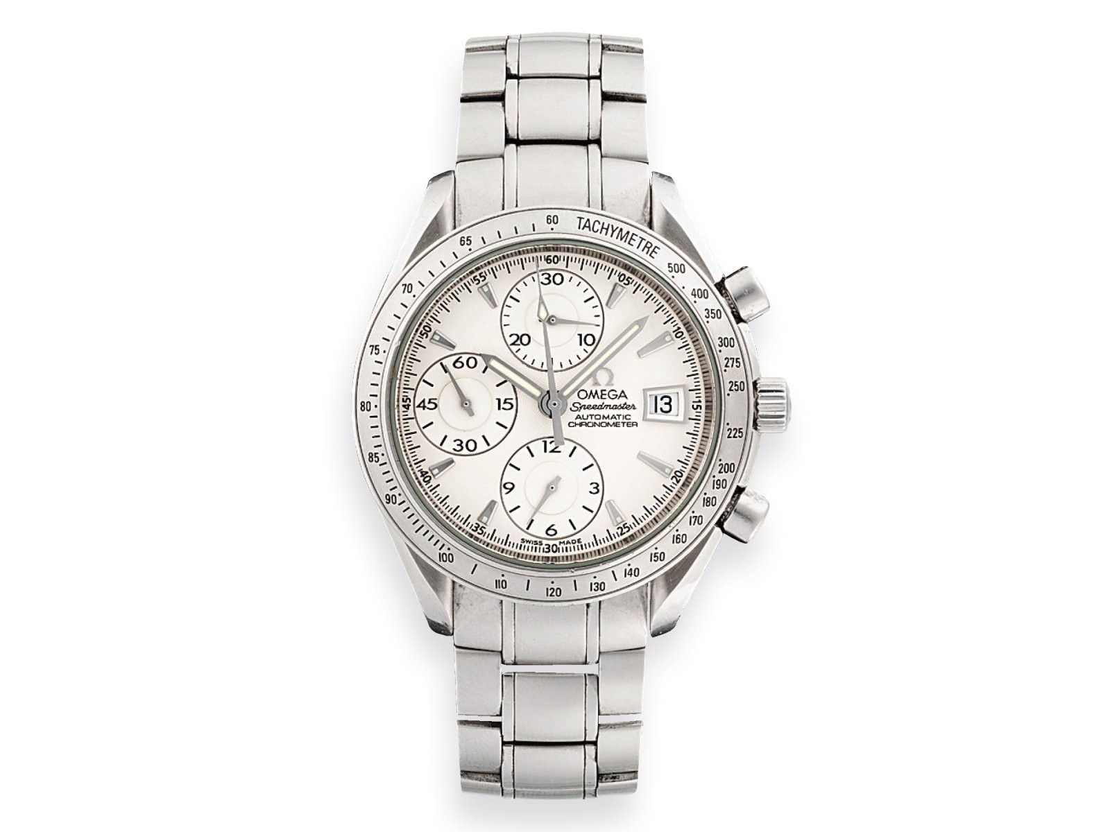 Acéltok és -szíj, lünetta tachymeter skálával, 3 segédkörös fehér számlap dátumkijelzéssel, zafír kristályüveg, 100 méterig vízálló