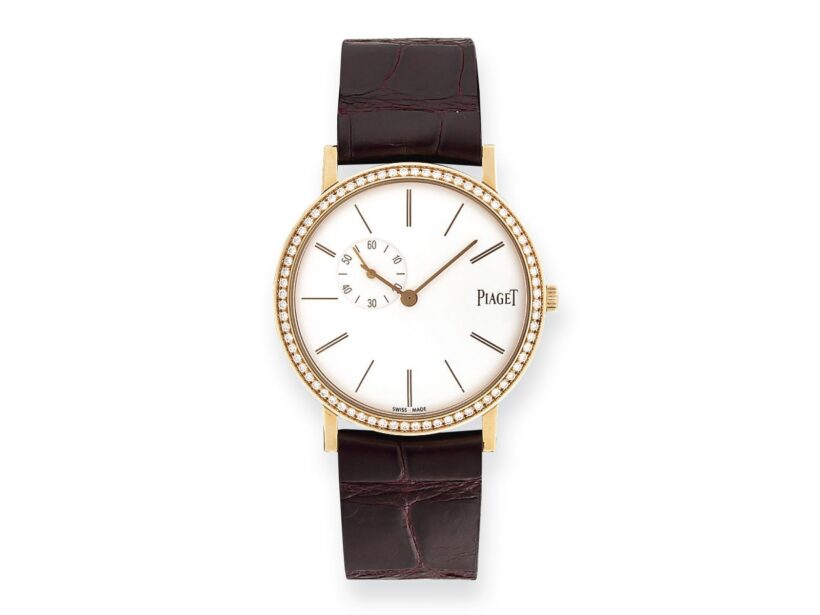 Rosé arany 750 tok és csat, bőrszíj, másodperckörös fehér számlap zafírüveggel, lünettába foglalt 72 db briliáns cca. 0,5 ct (MWVvs), 43 óra járástartalékkal 18 köves kézi felhúzású szerkezet (450P). Jelzett: Piaget Mécanique, referenciaszám: P10651, soro