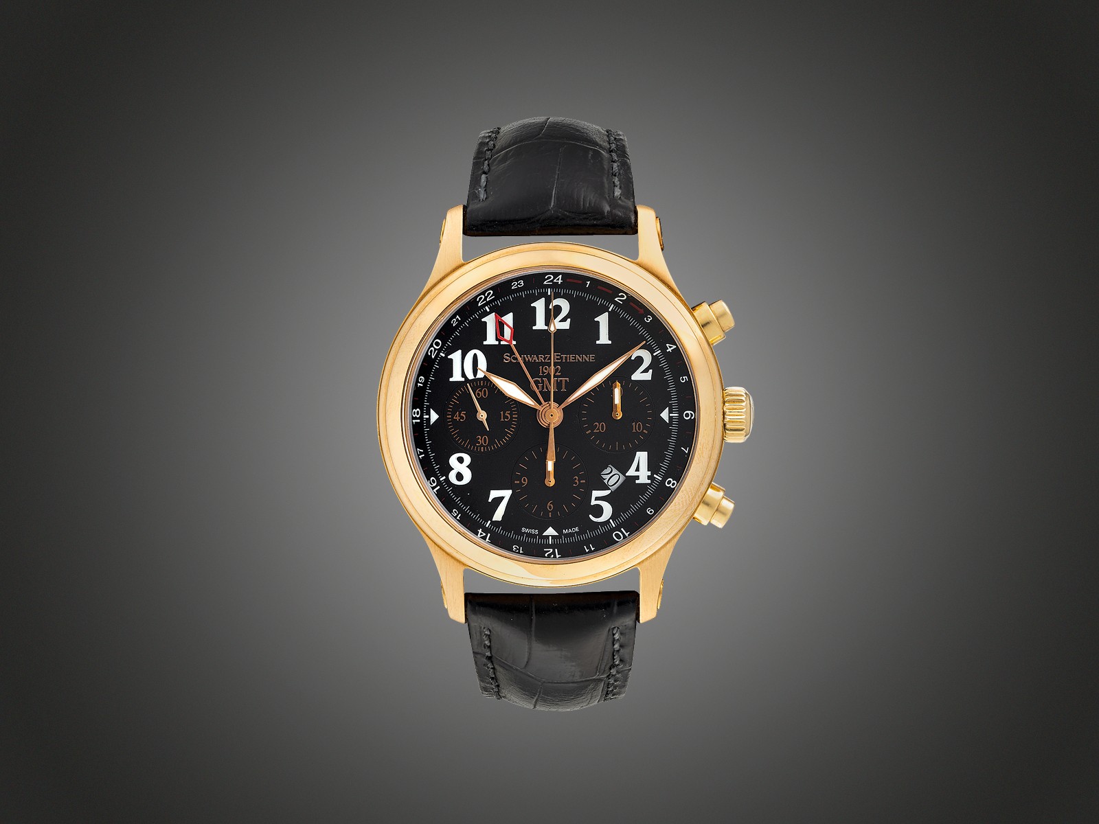 Arany 750 tok és csatvég, bőr szíj, fekete számlap arab számos indexekkel és második időzóna kijelzéssel. 50 méterig vízálló tok zafírüveggel. 28 köves automata stopperes szerkezet (Eta 7750). Jelzett: Schwarz Etienne, limitált kiadás (045), szériaszám: 2