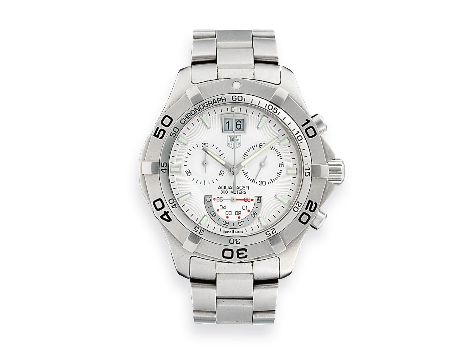 Acéltok és – csat, fehér számlap foszforeszkáló indexekkel stopper funkció gyűjtőkörrel és dátumkijelzéssel, zafírüveg, 300 méterig