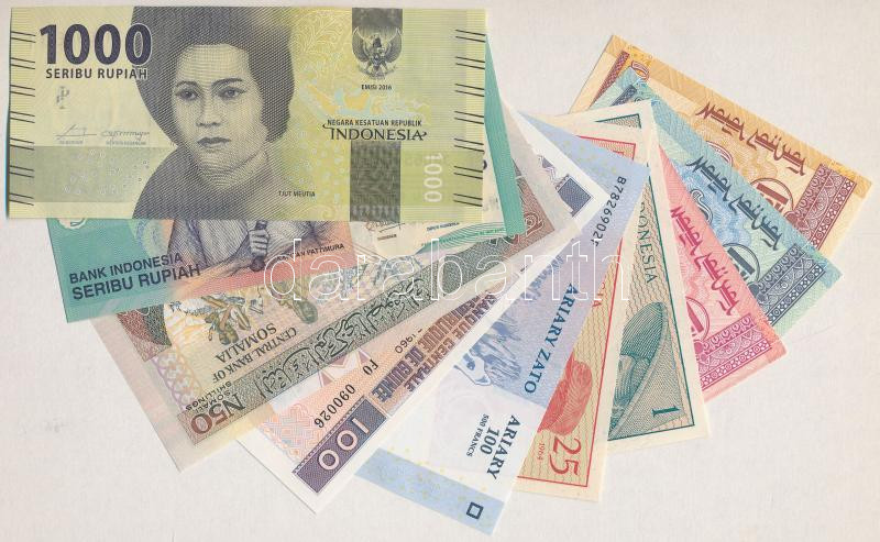 10 darabos vegyes külföldi bankjegy tétel, közte Mongólia, Indonézia, Szomália, Madagaszkár T:I,I- 10 pieces mixed banknote lot, among Mongolia, Indonesia, Somalia, Madagascar C:UNC,AU