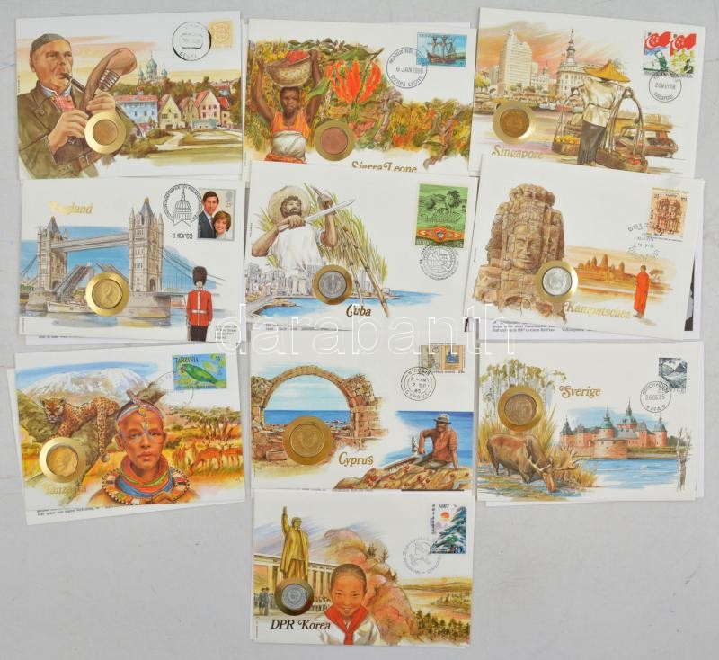 10db-os érmés boríték tétel, mind különféle és német nyelvű tájékoztatóval, benne: Észtország, Sierra Leone, Szingapúr, Nagy-Britannia, Kuba, Kambodzsa, Tanzánia, Ciprus, Svédország, Észak-Korea T:1<a href="https://www.darabanth.com/hu/gyorsarveres/