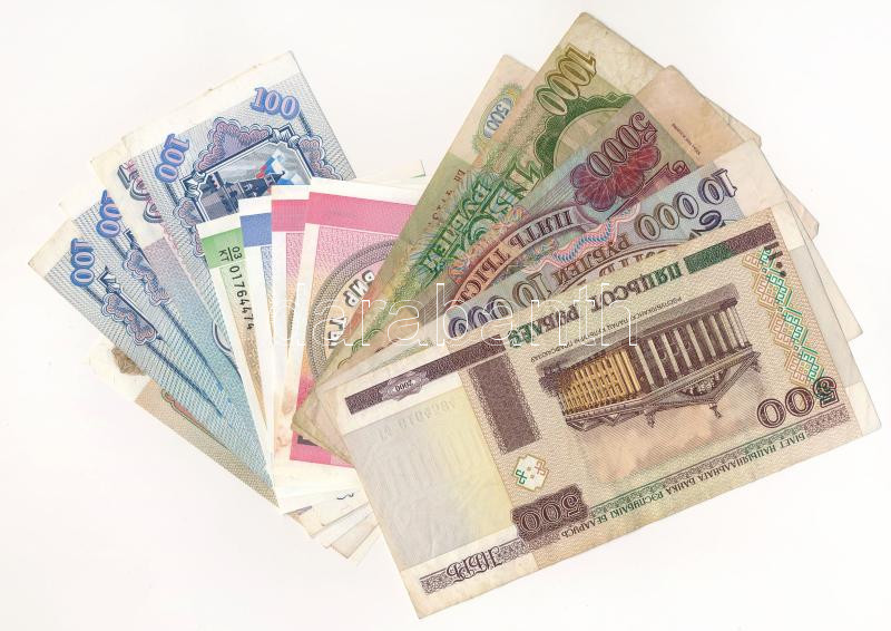 15db-os vegyes bankjegy tétel, közte Oroszország, Fehéroroszország, Tádzsikisztán, Kirgizisztán T:I–III- közte folt, szakadás 15pcs of mixed banknote lot, in it Russia, Belarus, Tajikistan, Kyrgyzstan C:AU-VG spot, tear in it