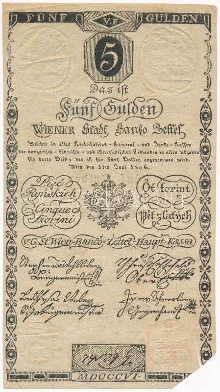 1806. 5G ‘Bécsi városi bankócédula’ vízjeles papíron, szárazpecséttel T:III sarokhiány, onnan kiindulva a papírba belevágtak Habsburg Monarchy 1806. 5 Gulden ‘Wiener-Stadt Banco-Zettel’ with watermark and embossed stamp C:F missing corner, from there the