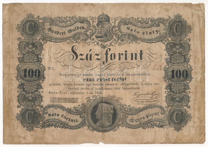 1848. 100Ft ‘Kossuth bankó’ ‘74485’ sorszámmal T:III-,IV hátlapon ragasztónyom kék elszíneződéssel Hungary 1848. 100Ft ‘Kossuth banknote’ with ‘74485’ serial number C:VG,Pr gluemark with blue discoloration on the backside Adamo G114<a href="https://