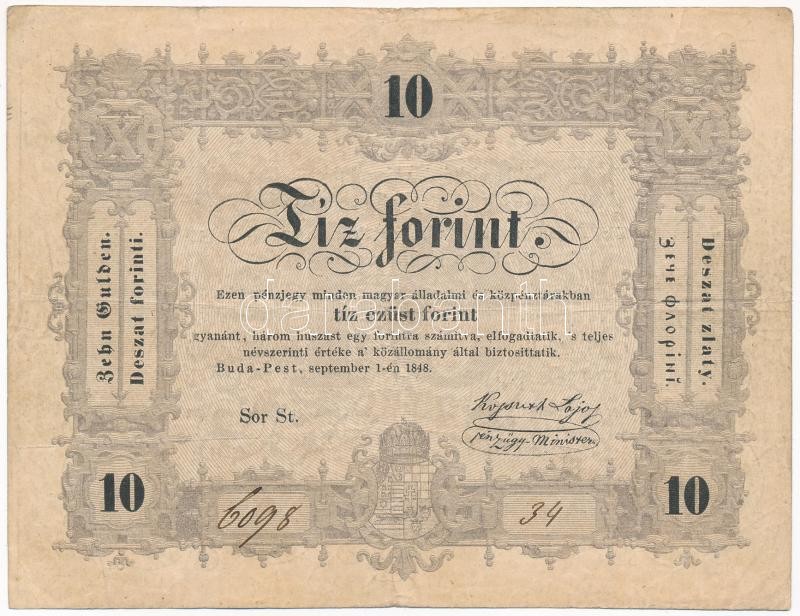 1848. 10Ft ‘Kossuth bankó’ ‘St 6098 34’ T:III Adamo G111<a href="https://www.darabanth.com/hu/gyorsarveres/421/kategoriak~Numizmatika/Magyar-bankjegyek~3000007/1848-10Ft-Kossuth-banko-St-6098-34-TIII–Adamo-G111~II2668021/?utm_source=affiliate&utm_