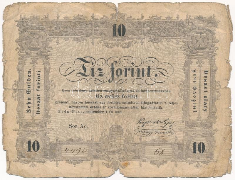1848. 10Ft ‘Kossuth bankó’ vörösesbarna ‘Aq 4490 68’ T:III- fo. Adamo G111<a href="https://www.darabanth.com/hu/gyorsarveres/418/kategoriak~Numizmatika/Magyar-bankjegyek~2000007/1848-10Ft-Kossuth-banko-vorosesbarna-Aq-4490-68-TIII-fo-Adamo-G111~II26
