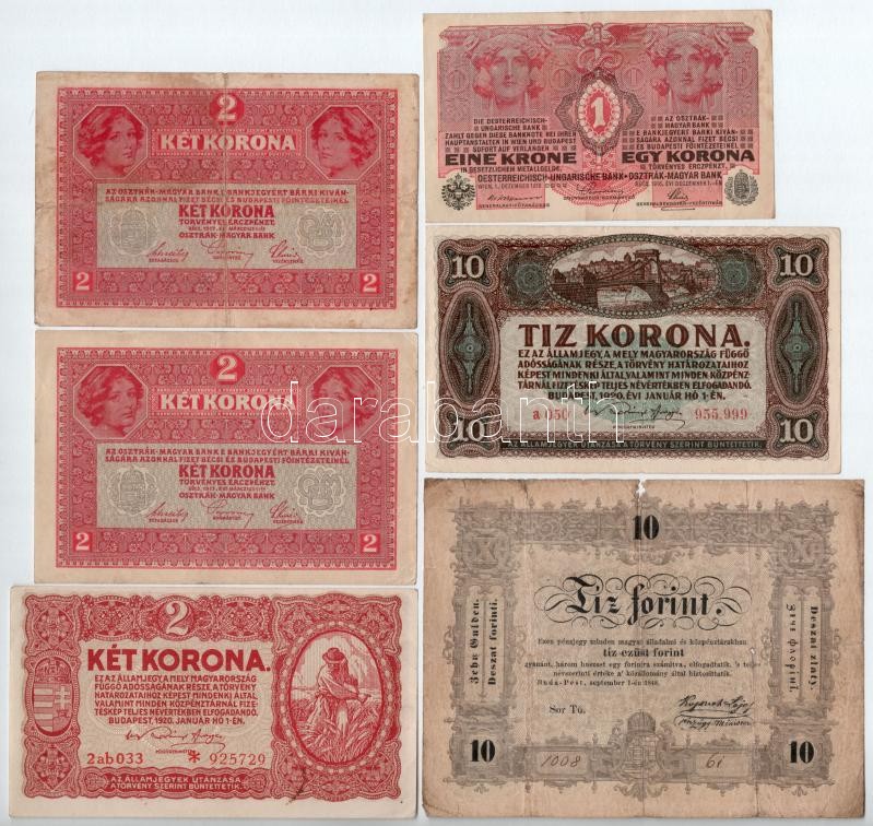 1848. 10Ft ‘Tű 1008 6i’ + 1916. 1K + 1917. 2K (2db) + 1920. 2K (csillagos sorszám) + 1920. 10K T:II-III-<a href="https://www.darabanth.com/hu/gyorsarveres/417/kategoriak~Numizmatika/Magyar-bankjegyek~2000007/1848-10Ft-Tu-1008-6i-plus-1916-1K-plus-19