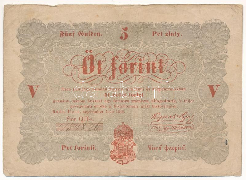 1848. 5Ft ‘Kossuth bankó’ vörösesbarna T:F folt, kis szakadás Adamo G109